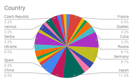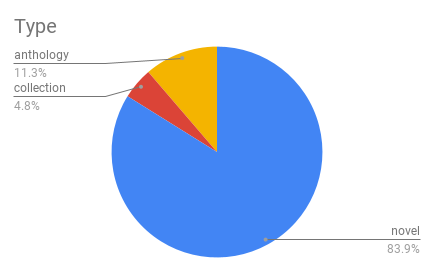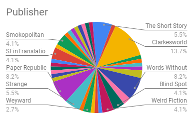 SQ, Granta, The Common, Daily Science Fiction, Electric Lit, Tor.com, PodCastle, SuperSonic, The Guardian, The Offing, World Literature Today, The New Yorker, Motherboard, In Translation, Galaxy’s Edge, Cyäegha, The Singularity, Aphelion, Finnish Weird, Trafika Europe– 1 each (1.4%)