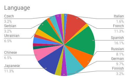 Arabic, Czech, Finnish, Hebrew, Korean, Serbian- 2 each (3.2%)