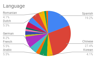 Italian, Korean, Polish, Romanian- 3 each (4.1%)