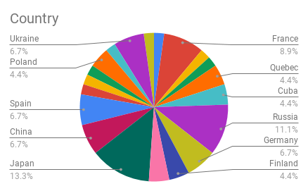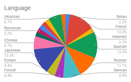 French (6), Spanish (6), Japanese (5), Russian (5), Chinese (3), Ukrainian (3), Finnish (2), German (2), Korean (2), Arabic (1), Bulgarian (1), Dutch (1), Hebrew (1), Italian (1), Icelandic (1), Polish (1), Romanian (1)
