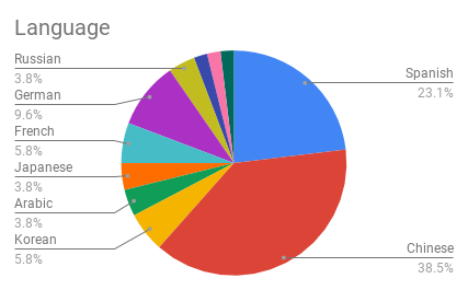 Arabic, Japanese, Russian- 2 each (3.8% each)