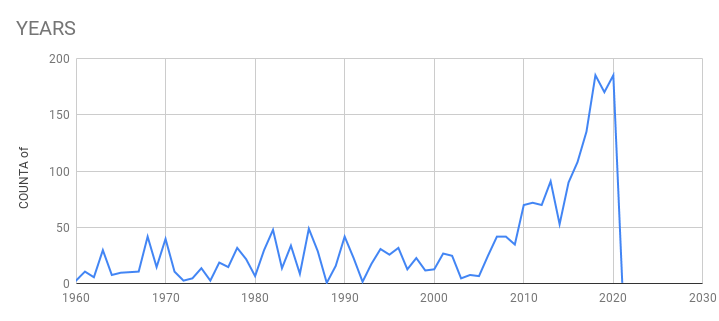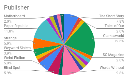 The Guardian, The Offing, World Literature Today, The New Yorker, Motherboard, Tales of Our Time, Persistent Visions, SQ Magazine, Granta, The Common, Daily Science Fiction, Pathlight, Tor.com, PodCastle- 1 each (1.9% each)