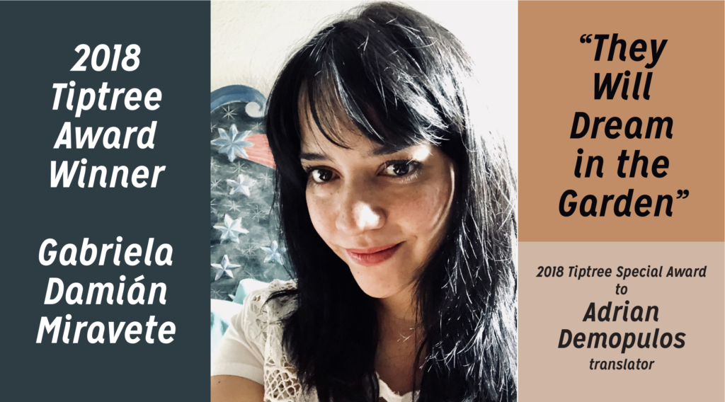 Gabriela Damián Miravete has won the 2018 Tiptree Award for her short story “They Will Dream In the Garden,” translated by Adrian Demopulos and published online by Latin American Literature Today (May 2018).